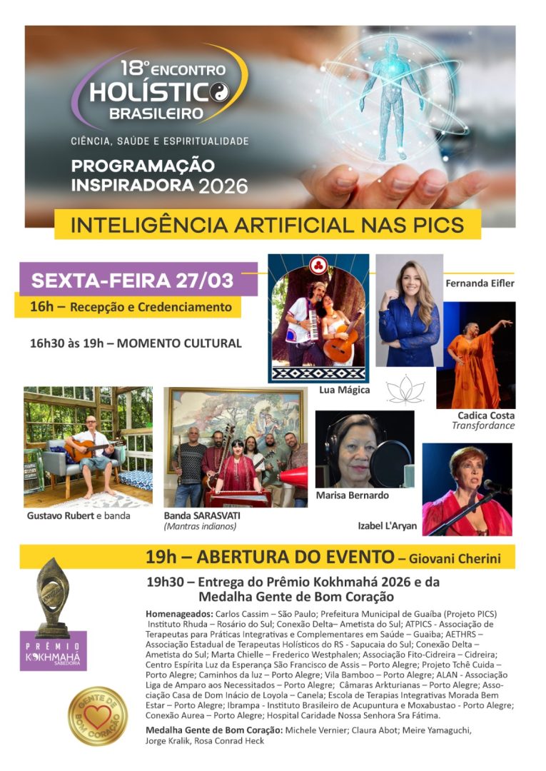 O 18° Encontro Holístico Brasileiro acontece de 27 à 29 de março, no Centro de Convenções da PUC-RS, em Porto Alegre. O tema deste ano é SAÚDE, CIÊNCIA E ESPIRITUALIDADE.
