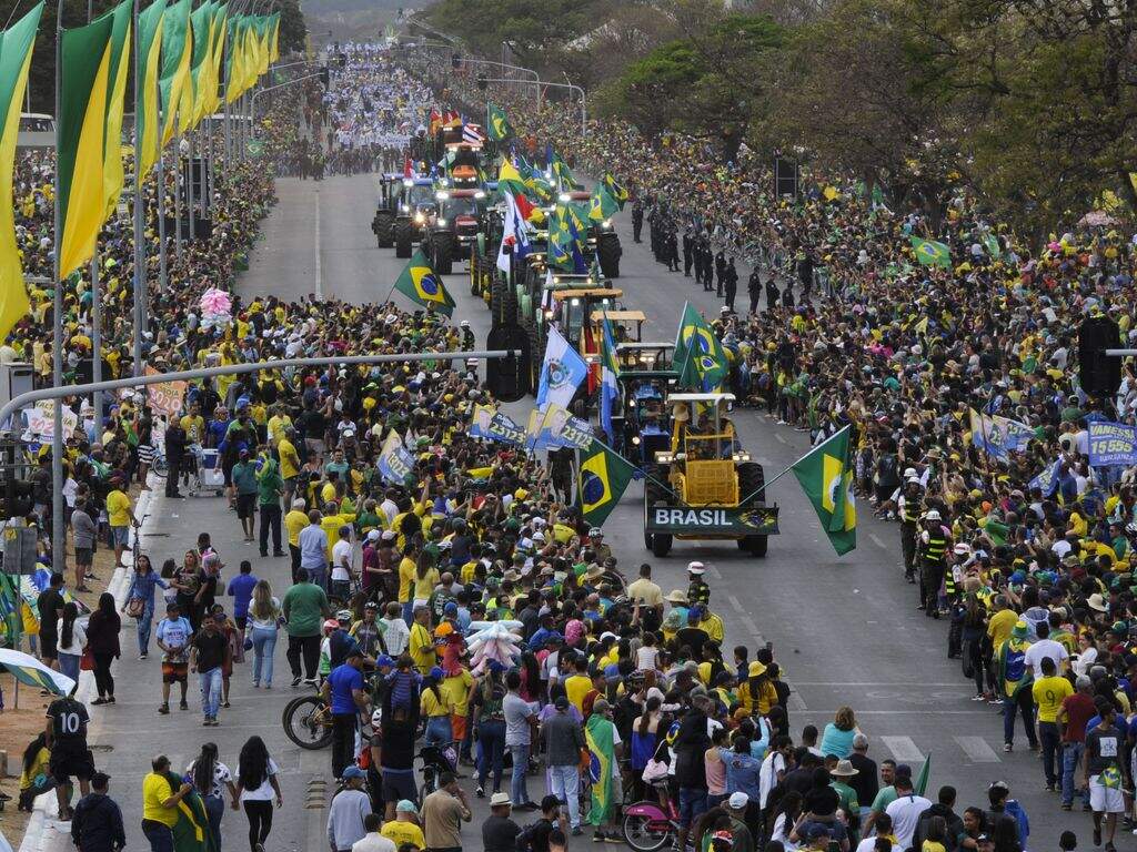 Em tom de campanha eleitoral, Bolsonaro, candidato à reeleição, discursou após o desfile cívico-militar. Seguindo gritos dos que acompanhavam o discurso na Esplanada dos Ministérios, Bolsonaro puxou coro de “imbrochável”.
