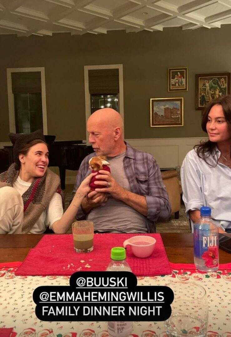 Após ter anunciado sua aposentadoria por conta do diagnóstico de afasia, um transtorno de linguagem ocasionado por lesão cerebral, que tem como causa mais comum o AVC (Acidente Vascular Cerebral), mas pode ter outras causas que afetem o cérebro, Bruce Willis fez rara aparição após sua filha, Scout LaRue Willis, compartilhar uma foto em um jantar de família. Nelas, o ator aparece interagindo e sorrindo ao lado da esposa, Emma Heming.