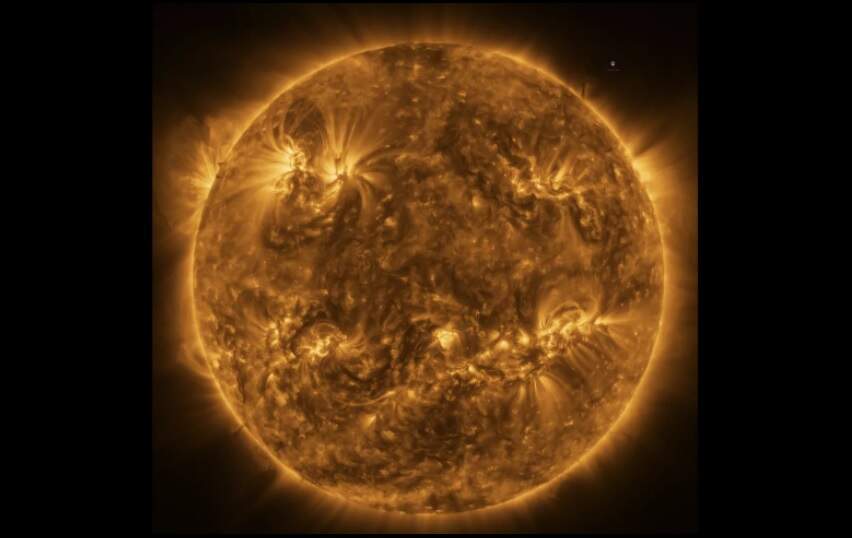 A imagem mostra a atmosfera superior do Sol, a coroa, que tem uma temperatura de cerca de 1 milhão de graus Celsius. A foto foi feita pelo satélite Solar Orbiter, em luz ultravioleta extrema, a uma distância de cerca de 75 milhões de quilômetros do Sol, segundo a ESA.