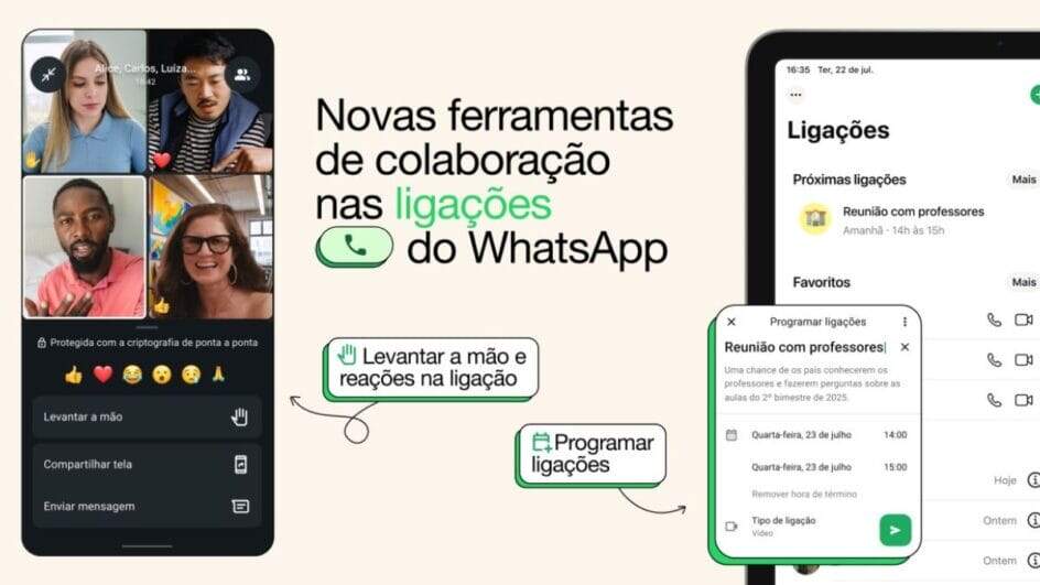 O WhatsApp ganhou novos recursos de chamadas, incluindo uma ferramenta para agendar ligações com antecedência. Além disso, em conferências em grupo, haverá um botão para levantar a mão e pedir a palavra, além de emojis para reações.