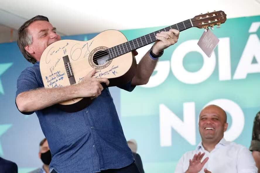 Em 28 de agosto de 2021, por exemplo, Bolsonaro foi presenteado com um violão acústico durante um evento em Goiânia (GO). De cima de um palco, o mandatário fez sinal de arma com o instrumento. O violão foi confeccionado em madeira, com cordas mistas em nylon e metal. No inventário, o assessor Marcelo Costa Câmara informou que a peça estava autografada pelos cantores Amado Batista, Gusttavo Lima e Marrone (da dupla Bruno e Marrone).