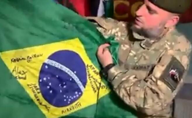 Em seguida, o checheno mostra a bandeira do Brasil e diz que ela foi pega “de uma legião estrangeira que destruímos”.