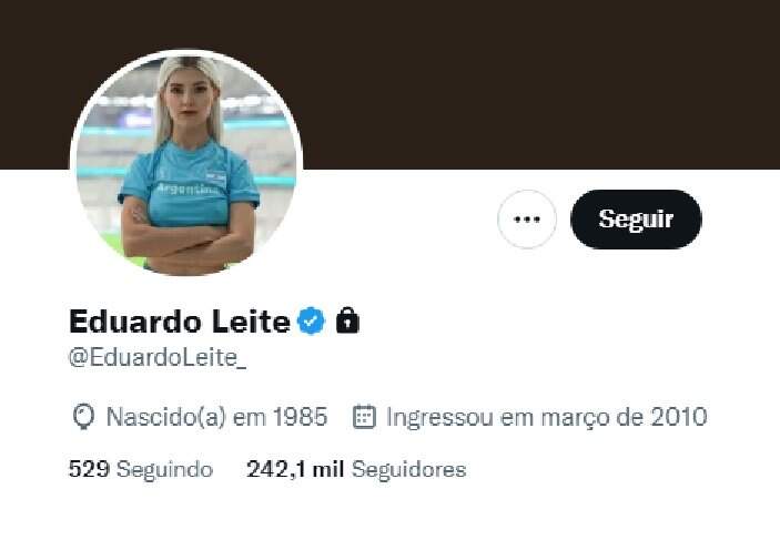 Além da foto da estrela de produções “adultas”, o perfil do governador no Twitter tem ostentado apenas o nome “Eduardo Leite” e a indicação “nascido em 1985” (informação que está correta). No primeiro dia do ataque, também aparecia “Líbano” em vez de Brasil como país do usuário.