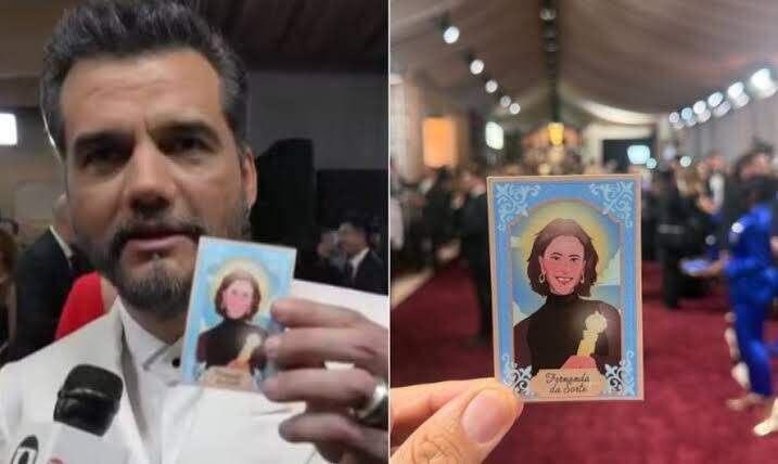 Quando perguntado se havia levado alguma coisa para dar sorte no dia da premiação, Moura tirou do bolso a “santinha” de Fernanda Torres e contou que recebeu a imagem em um estande do próprio evento. Outros integrantes do elenco e equipe de “O agente secreto” também ficaram com a “santinha”. Alice Carvalho e Gabriel Leone falaram quem falaram: “Santa Nanda da Sorte”.