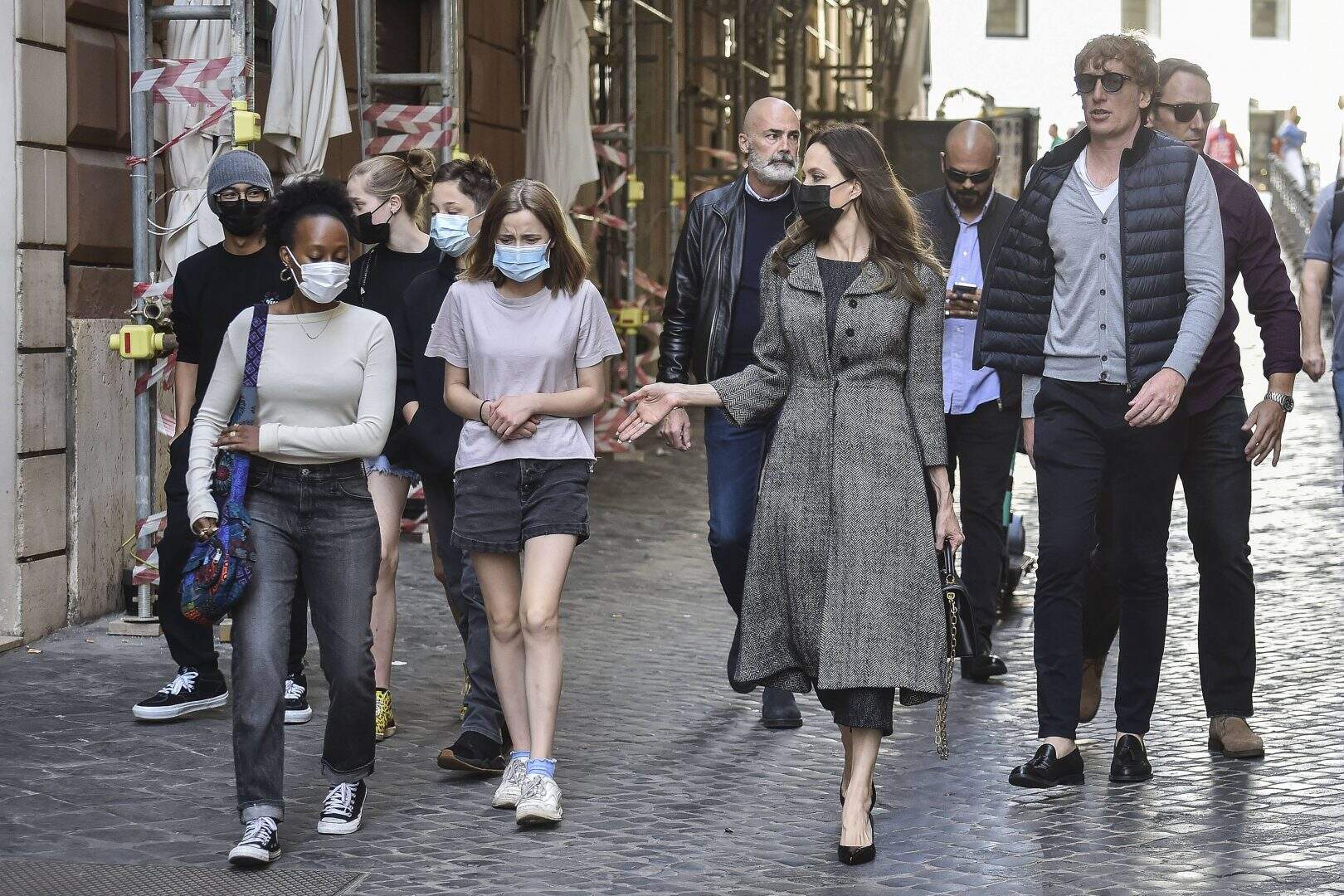 Angelina Jolie, que está em Roma promovendo seu novo longa, Eternos, passeou com cinco de seus seis filhos com Brad Pitt pelas ruas da cidade italiana. De máscara, ela estava com um sobretudo cinza e salto alto, dando mais um show de elegância.