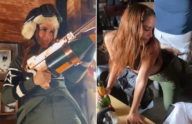 Animadíssima, a cantora usou uma bazuca dourada e fez “chover champanhe” para os outros que estavam no local. Ela ainda dançou muito, arrasando no rebolado durante o passeio.