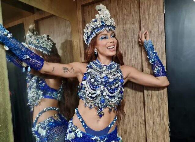 m sua própria homenagem, Anitta usa um tecido que remete à rede de pescadores, repleta de conchas do mar. O acessório, inclusive, está presente em todo o top e na coroa usada pela artista.