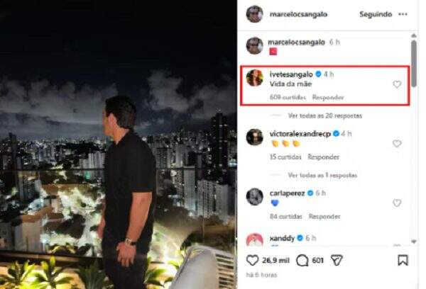 Ivete Sangalo, de 53 anos, mandou uma mensagem fofa ao filho mais velho, Marcelo Sangalo, de 16, na madrugada desse sábado (29) após o jovem postar uma foto no Instagram. Na imagem, ele aparece no terraço de um prédio olhando para a cidade iluminada. Nos comentários da publicação, a cantora se declarou ao primogênito: “Vida da mãe”.
