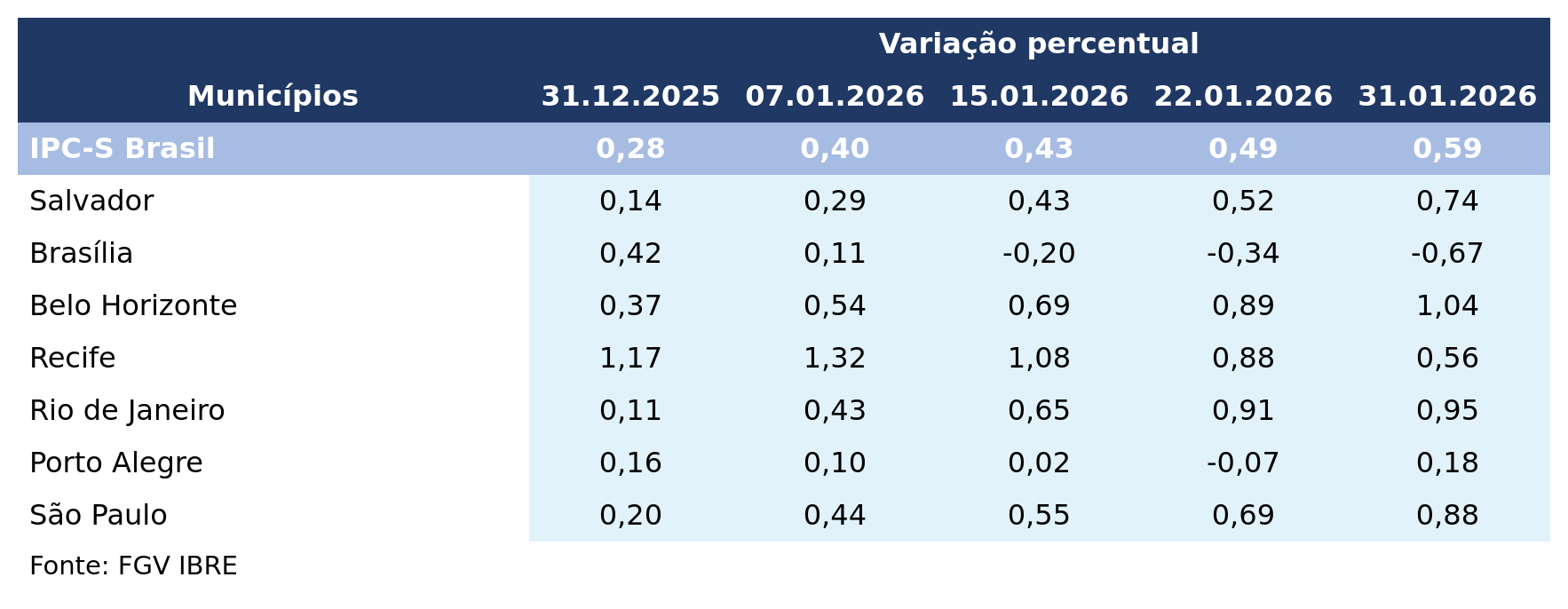 Houve recuo no IPC-S em Brasília (-0,34% para -0,67%) e em Recife (0,88% para 0,56%).