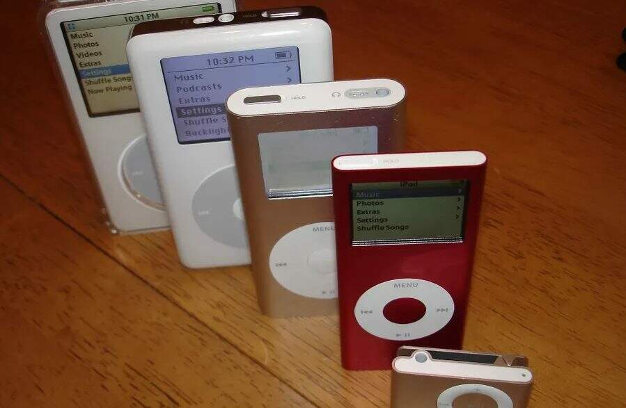 – iPod shuffle: a linha teve quatro gerações, foi a única a não ter tela e, como o nome indica, tocava músicas no modo aleatório;