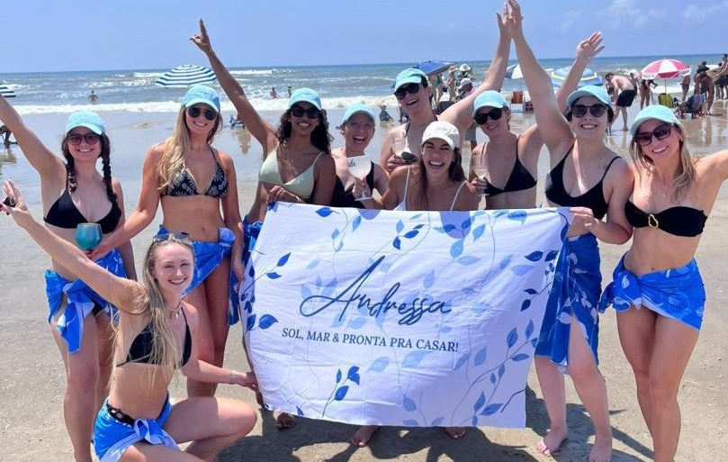 O ponto alto foi o desfile das madrinhas pela areia de Atlântida, perto da quadra de Beach Tennis da Rede Pampa, todas vestidas de forma idêntica e carregando um banner com a foto da noiva — e a própria noiva, por óbvio, sendo conduzida com entusiasmo. Entre elas estavam Andressa Neunfeld, Carolina Gebahardt Gehling, Caroline Schneider, Caroline Untisesck, Franciane Barro, Jéssica Deves, Karol Trasel, Lucimara Bragnanolo, Luíza Araújo de Souza, Marília Cardozo, Marina Antonioli, Natália Franz, Raissa Prade e Tamires Santo. Além de exibir o banner, elas arrastaram Andressa pela praia, apresentando-a a cada veranista, contando histórias engraçadas e tirando fotos com quem assava churrasco na orla. Enquanto isso, Josias permanecia na barraca, comandando o fogo e preparando o churrasco junto aos padrinhos. Depois, todos se reuniram para celebrar juntos, entre música, risadas e um belo churrasco coletivo.