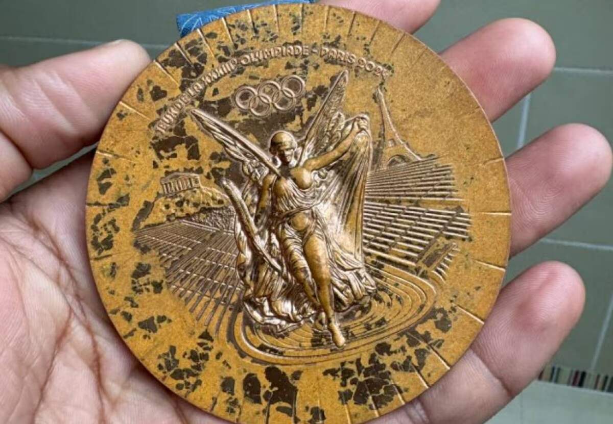 Yohann Ndoye Brouard publicou uma foto da medalha, que aparenta muito danificada dos dois lados, descascando e sem brilho.