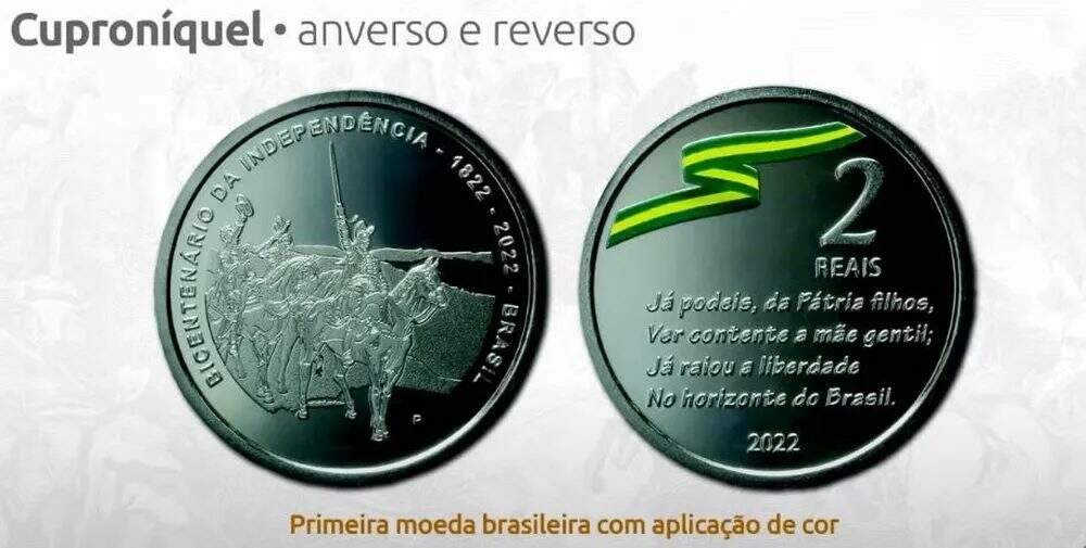 Segundo o BC, a moeda de R$ 2, feita em cuproníquel, é a primeira da história a conter detalhes coloridos em um dos lados. O reverso da moeda exibe uma faixa verde-amarela e a primeira estrofe do Hino da Independência, escrito por Evaristo da Veiga.