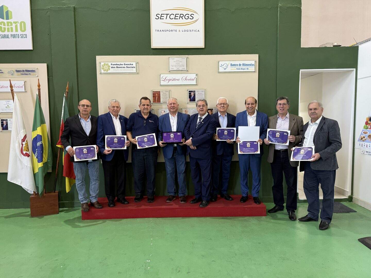 O atual presidente do SETCERGS, Delmar Albarello, foi homenageado ao lado de seus antecessores, em reconhecimento à contribuição histórica da entidade. Durante a cerimônia, foram descerradas placas nas galerias de honra do SETCERGS e do CEPORTO, registrando o nome de Albarello como símbolo de dedicação ao desenvolvimento do setor e à logística social.
