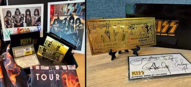 2 ingressos do show final do KISS no Madison Square Garden, banhados a ouro 24k, estampados frente e verso com número exclusivo gravado a laser e acompanhados de certificado do ingresso original, autografado pela banda;