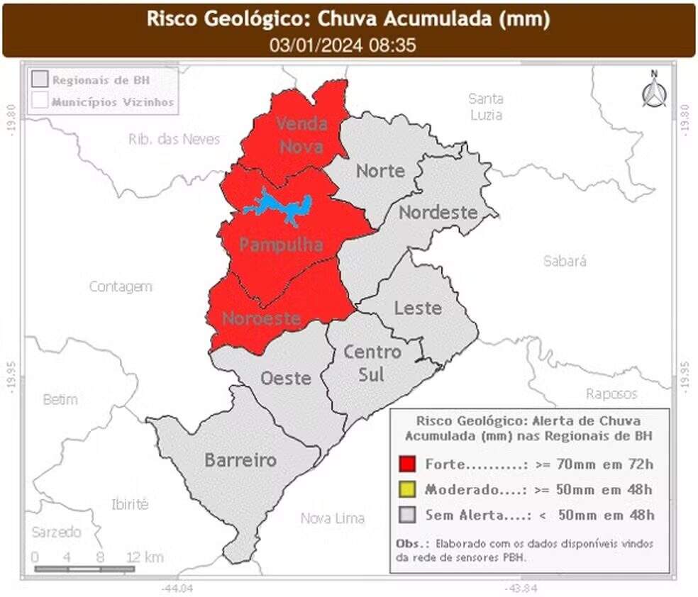 A Defesa Civil emitiu, nesta quarta-feira (3), alerta de risco geológico forte para três regiões de Belo Horizonte (MG). Segundo a prefeitura, cerca de mil imóveis estão nestas áreas, principalmente em vilas e favelas. A advertência é válida até a próxima segunda-feira (8).