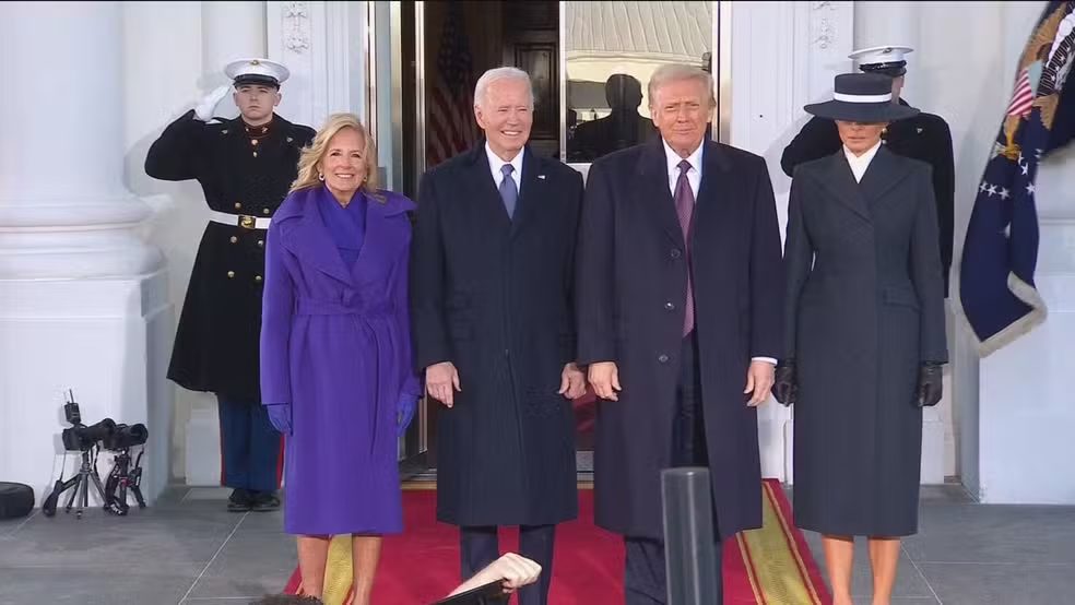 “Bem-vindo ao lar”, disse Biden ao cumprimentar Trump. O vice-presidente J.D. Vance chegou antes de Trump à Casa Branca e foi recebido por Kamala Harris. Seus respectivos cônjuges de Vance e Kamala, Usha Vance e Doug Emhoff, respectivamente, acompanhavam-nos no ato cerimonial.