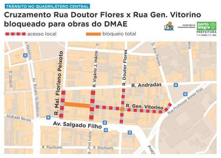 A Prefeitura de Porto Alegre alerta para bloqueio que terá impacto na mobilidade da região central na próxima semana. Em razão de obras do Dmae (Departamento Municipal de Água e Esgotos) no Quadrilátero Central, o cruzamento da rua Doutor Flores com rua Gen. Vitorino será bloqueado de terça-feira (26), até quinta-feira (28).