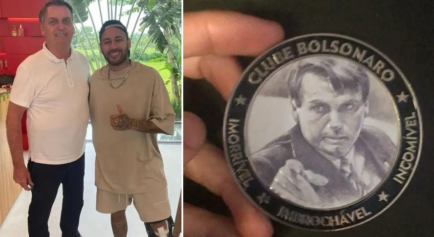 Jair Bolsonaro (PL) entregou ao jogador Neymar uma medalha com a imagem do ex-presidente estampada e as palavras “imorrível, imbrochável e incomível”. O objeto tem sido distribuído por Bolsonaro a aliados e apoiadores.