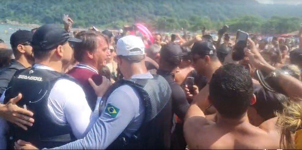 Já na manhã de domingo (27), Bolsonaro saiu do Forte dos Andradas e novamente passeou de moto aquática. Por volta das 10h, ele desceu do veículo e cumprimentou banhistas, o que provocou uma aglomeração na praia do Guaiúba.