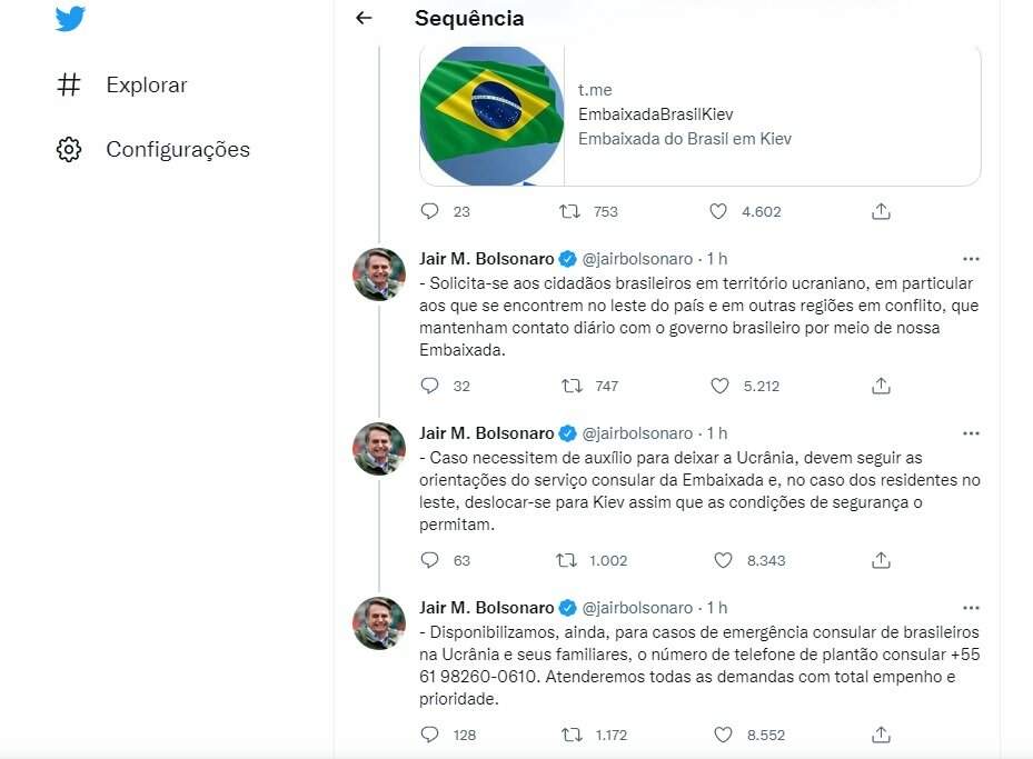 O presidente Jair Bolsonaro (PL) quebrou o silêncio e se pronunciou sobre o ataque russo à Ucrânia, entretanto, ainda não falou sobre a invasão bélica. Em rede social, o chefe do Executivo afirmou estar “totalmente empenhado” em proteger e auxiliar os brasileiros que estão na Ucrânia. Segundo ele, a embaixada em Kiev está “aberta e pronta a auxiliar” os cidadãos brasileiros no território ucraniano.