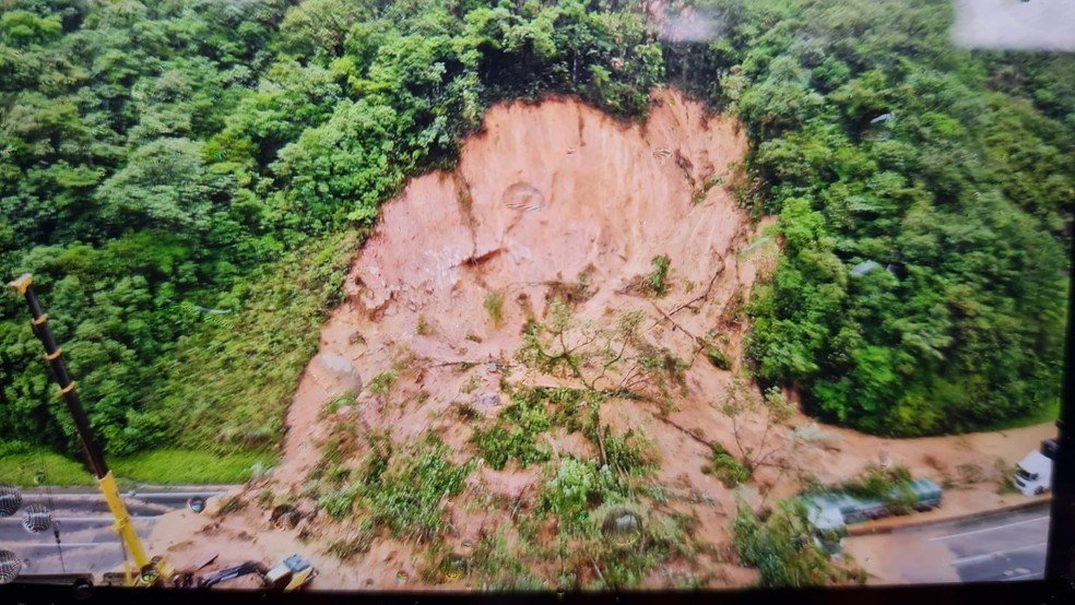 Equipes da concessionária Arteris Litoral Sul continuam no local realizando trabalho de limpeza da rodovia, retirando lama, pedras e recapeando o asfalto.