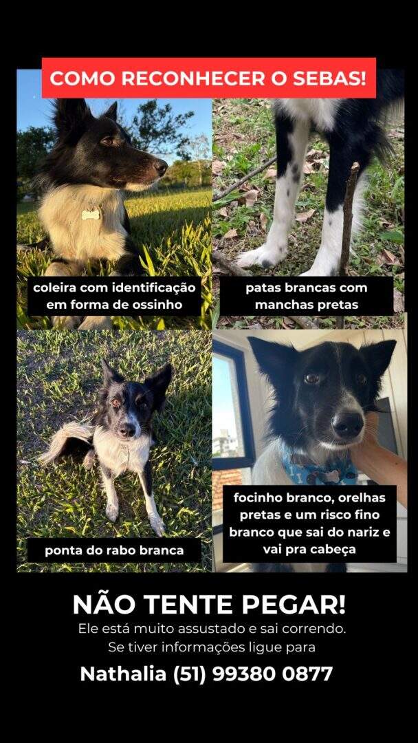 Quem visualizar o animal pode avisar a sua tutora, Nathalia Fritsch, pelo telefone/WhatsApp (51) 9938-00877 ou pelo Instagram @nathifritsch. Na rede social, também tem fotos do border collie. Nathalia oferece uma recompensa para quem achar o cão.