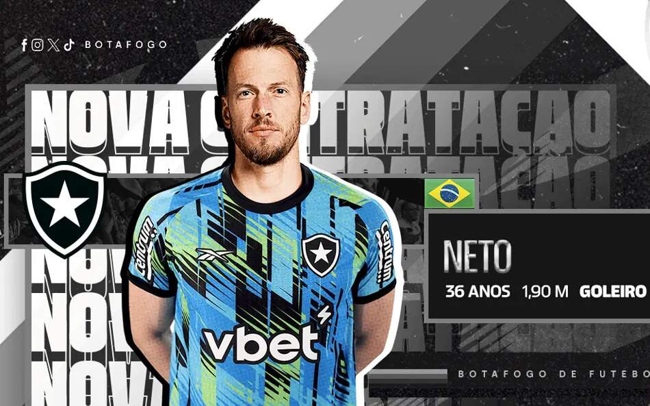 O Botafogo oficializou nesta sexta-feira (8) a contratação do goleiro Neto, de 36 anos, que estava no Bournemouth, da Inglaterra. O experiente arqueiro assinou contrato com o atual campeão brasileiro até junho de 2027 e já está no Rio de Janeiro, onde realizou exames médicos e iniciou os primeiros contatos com o elenco alvinegro.
