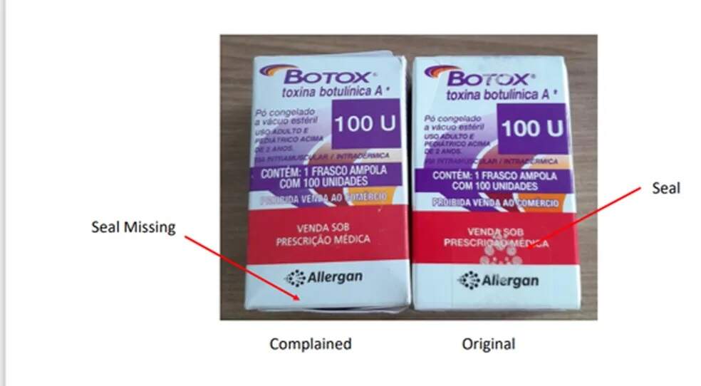 No caso do Botox, a Allergan Produtos Farmacêuticas, responsável pelo produto, informou à agência, foram detectados dois produtos falsificados no lote C7654C3F. Porém há também unidades originais. Portanto, é preciso atentar-se a alguns detalhes para identificar se é o caso de uma falsificação.