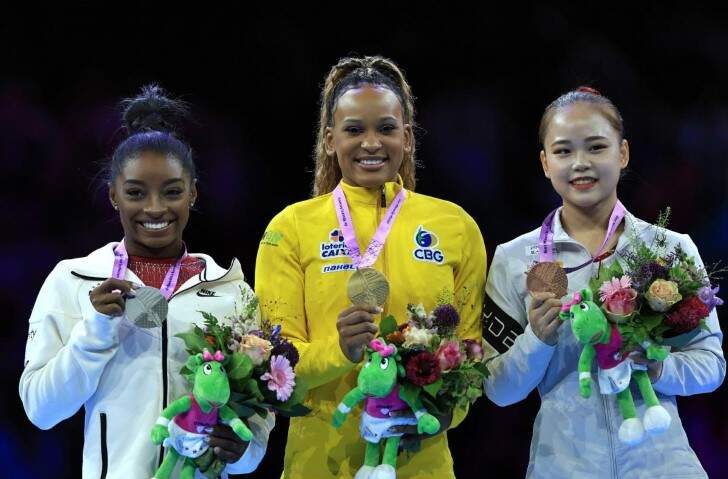 Rebeca Andrade mal celebrou a prata conquistada no individual geral na sexta e retornou ao pódio na manhã deste sábado, mas desta vez no lugar mais alto, na Antuérpia. O ouro veio na final do salto, mais uma vez com a presença de Simone Biles. Rebeca conseguiu executar os dois saltos quase cravados, teve média 14,750 pontos e foi coroada bicampeã mundial.