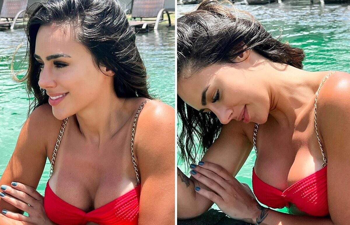 Bruna Biancardi, namorada de Neymar, postou fotos de dias de piscina com um biquíni vermelho decotado e mostrou a marquinha do bronzeado. Os cliques foram publicador por ela no seu perfil no Instagram, na noite desta quarta-feira (9).