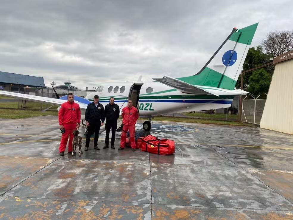 Um dos cães e dois bombeiros saíram de Londrina, no Norte do Estado, em um avião oficial do governo do Paraná, até Curitiba, onde outra dupla formada por cão e bombeiro completou a comitiva.