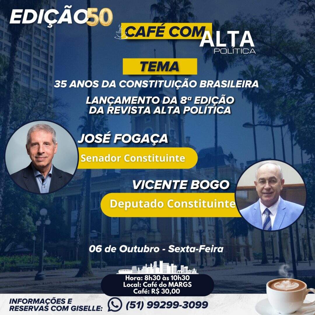 A 50ª edição do Café com Alta Política terá como tema os 35 anos da Constituição Brasileira. O evento será realizado na sexta-feira (6), a partir das 8h30min, no Café do Margs, na Praça da Alfândega, no Centro de Porto Alegre.
