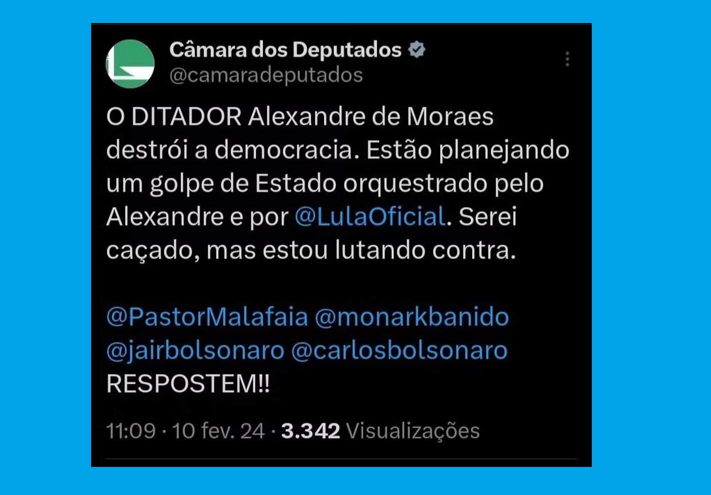 A conta hackeada publicou o seguinte post: “O DITADOR Alexandre de Moraes destrói a democracia. Estão planejando um golpe de Estado orquestrado pelo Alexandre e por @LulaOficial. Serei caçado, mas estou lutando contra”, afirmou a postagem.
