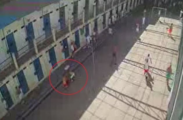 As imagens mostram o pátio do pavilhão onde os detentos permanecem durante o banho de sol e três presos perseguindo e atacando Janeferson Aparecido Mariano Gomes, o Nefo. Ele foi agredido até a morte no local.