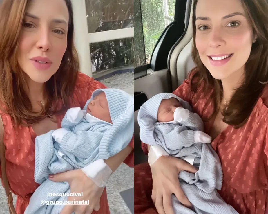 Camila Rodrigues deixou, nesta segunda-feira (07), a maternidade com o filho, Bernardo. O bebê é do relacionamento da atriz com o noivo, Vinicius Campanario. No Instagram Stories, ela registrou o momento de ir para casa.