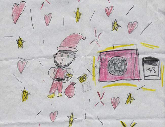 É o caso da cartinha da Sarah, de 5 anos, que pede uma boneca. O Eduardo, de 8 anos, sonha com uma pipa ou um carro de controle remoto. A Ana Júlia, de 12 anos, pediu ao bom velhinho uma bola de futebol. Já a Emanuely, de 7 anos, quer ganhar um livro de colorir (e fez o desenho, abaixo, para ilustrar o seu desejo).