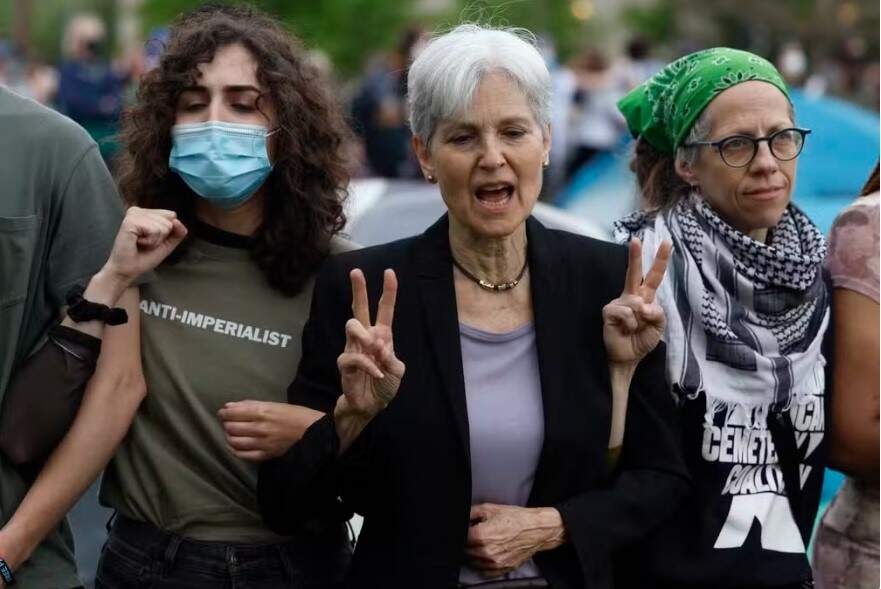 “Vamos ficar aqui na fila com os estudantes que estão defendendo a democracia, os direitos humanos e o fim do genocídio”, disse Stein.