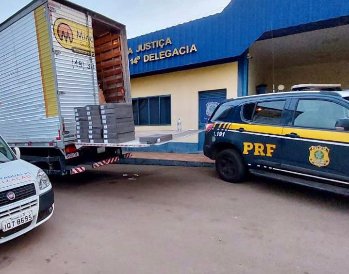 O condutor e o passageiro, de 26 e 28 anos, ambos catarinenses, foram presos por descaminho. Eles disseram que entregariam a carga para ser distribuída na região de Itajaí (SC),