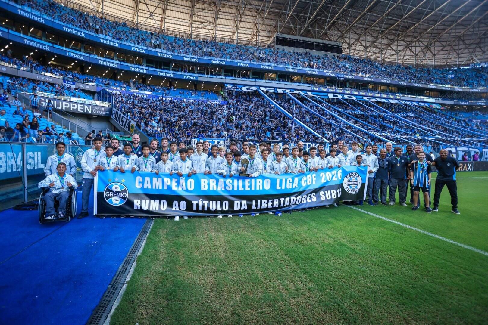 No último domingo (26), a equipe Sub-13 da Escola de Futebol do Grêmio realizou uma volta olímpica na Arena em comemoração à conquista inédita da Liga de Desenvolvimento CBF Transforma. O momento ocorreu no intervalo do jogo contra o Coritiba, válido pela 13ª rodada do Brasileirão.