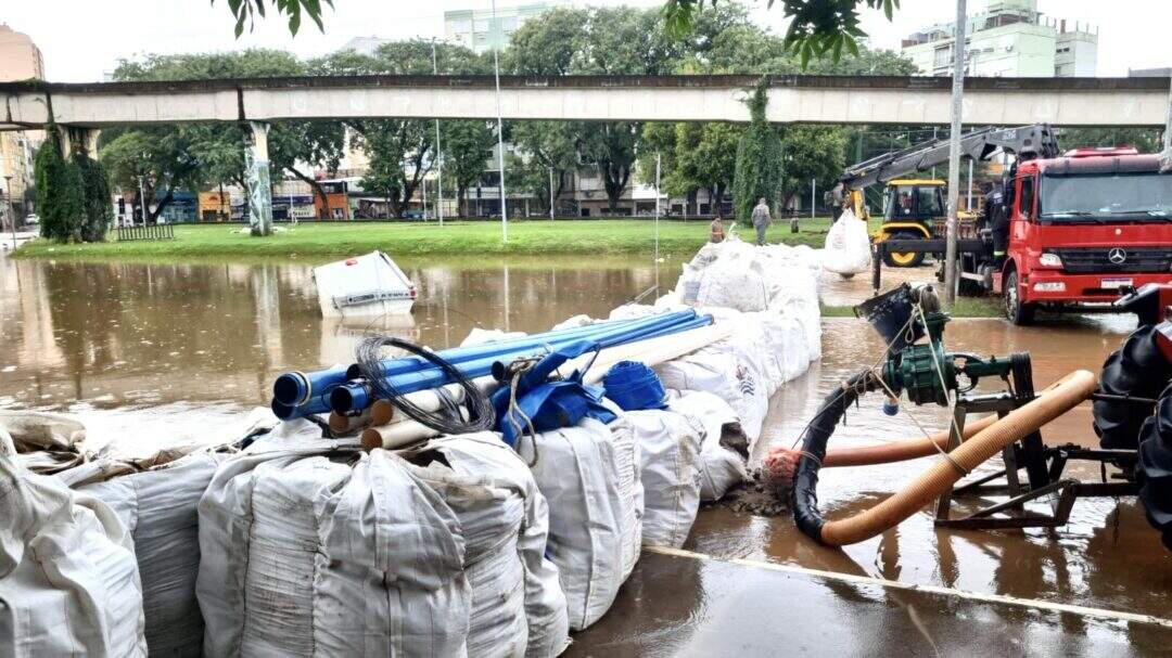 A água está nivelada dentro da cidade e para colocar em operação a Estação de Bombeamento de Águas Pluviais (Ebap) 15 foi necessária a criação deste pôlder, com sacos de areia, para evitar que siga avançando em direção aos bairros Cidade Baixa e Menino Deus.