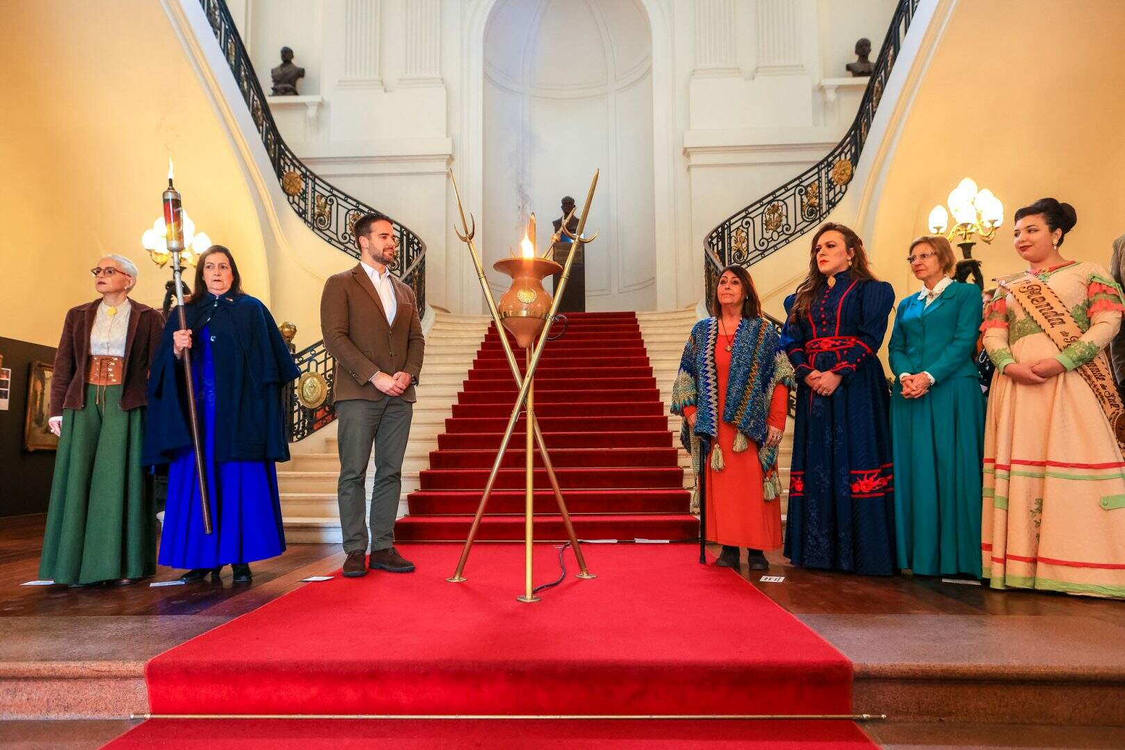 A Chama Crioula, símbolo da alma gaúcha, chegou ao Palácio Piratini na manhã desta quinta-feira (14). Depois de percorrerem as 30 regiões tradicionalistas do Estado até Porto Alegre, os cavalarianos entregaram a centelha à patrona dos festejos farroupilhas, Maria Luiza Benitez, e ao governador Eduardo Leite, que acendeu o Candeeiro Crioulo na entrada do palácio.