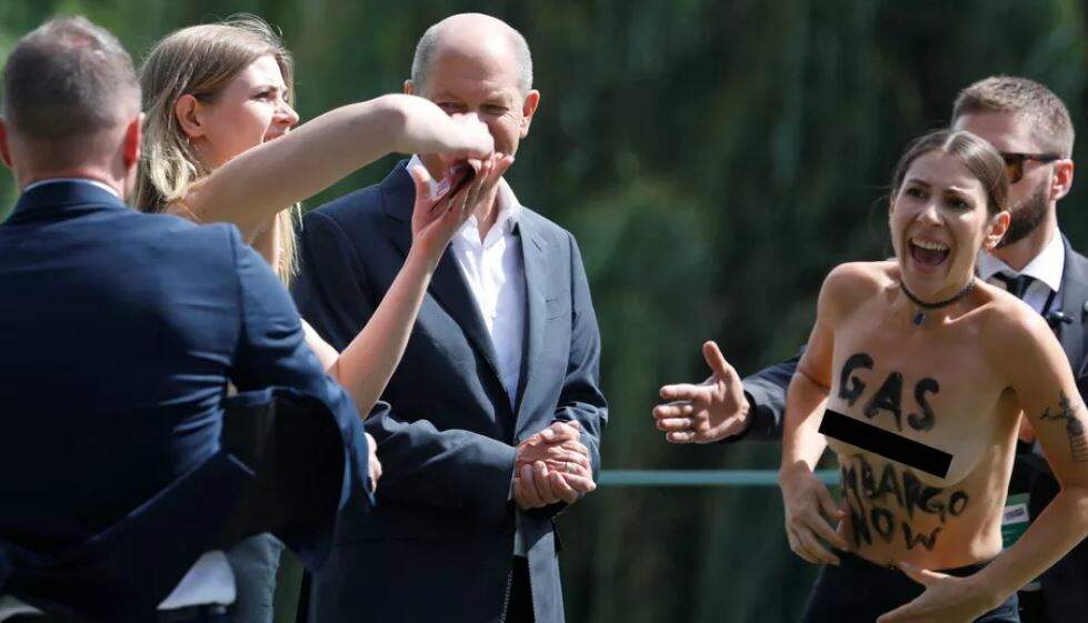 Olaf Scholz, chanceler alemão, foi surpreendido por duas manifestantes de topless durante o “Dia da Casa Aberta” do governo do país. As ativistas de topless tinham uma inscrição no corpo contra a Rússia, pedindo o “embargo ao gás, agora”.