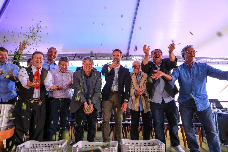 O governador Eduardo Leite, o titular da Secretaria da Agricultura, Pecuária, Produção Sustentável e Irrigação, Giovani Feltes, e outras autoridades, além de representantes do setor, participaram do evento de abertura da colheita, que ocorreu na sexta-feira (16) na propriedade Olivas de Gramado.