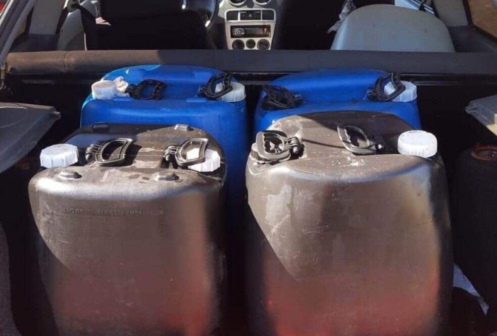 O combustível estava dividido em galões de 20 e de 5 litros, no porta-malas de um carro.