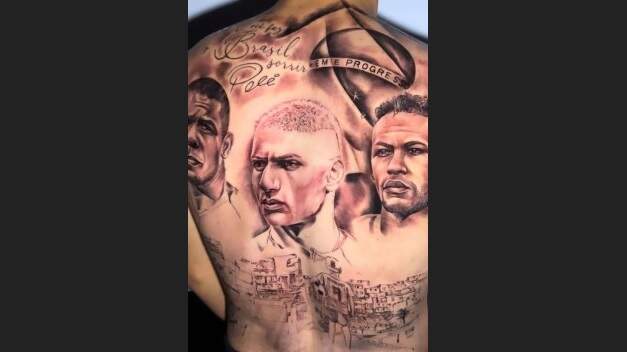 Centroavante da Seleção Brasileira, Richarlison surpreendeu os seguidores ao compartilhar no instagram uma imagem da nova tatuagem que ele fez nas costas. O atleta tatuou o próprio rosto ao lado de imagens de seu companheiro de Seleção, Neymar, e Ronaldo Fenômeno. Acima, além de parte da bandeira do Brasil, há também uma mensagem do Pelé para o atleta: “Você fez o Brasil sorrir. – Pelé”.