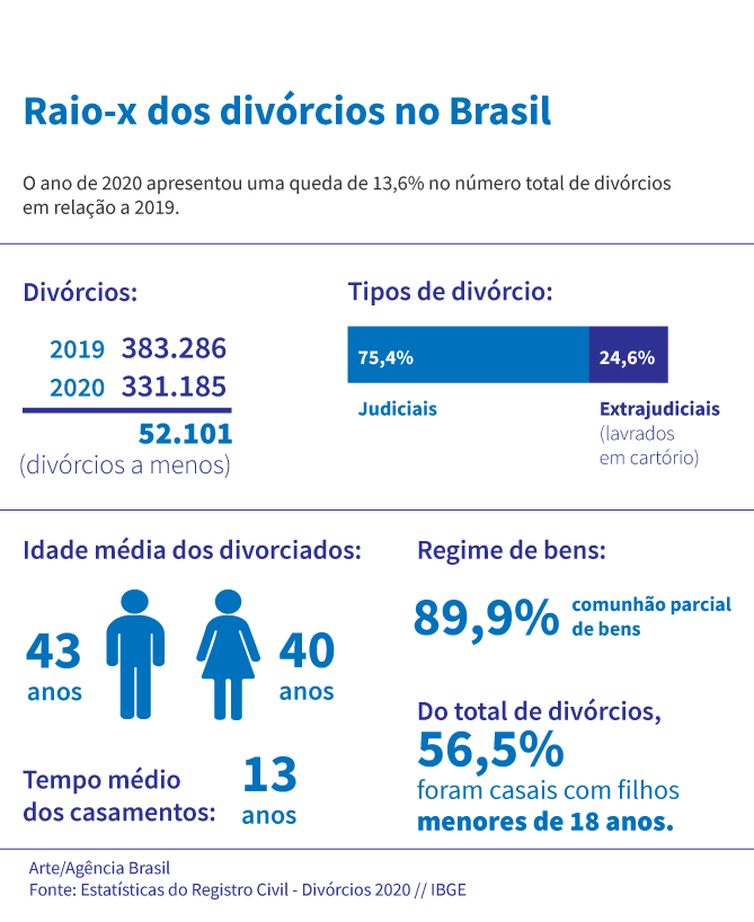 Os divórcios no Brasil caíram 13,6% em 2020 em relação a 2019, o equivalente a 52.101 rompimentos a menos. Ao todo, foram registrados 331.185 divórcios concedidos, dos quais 249.874 (75,4%) judiciais e 81.311 (24,6%) extrajudiciais lavrados em cartório. Em 2019, foram contabilizados 383.286 divórcios.