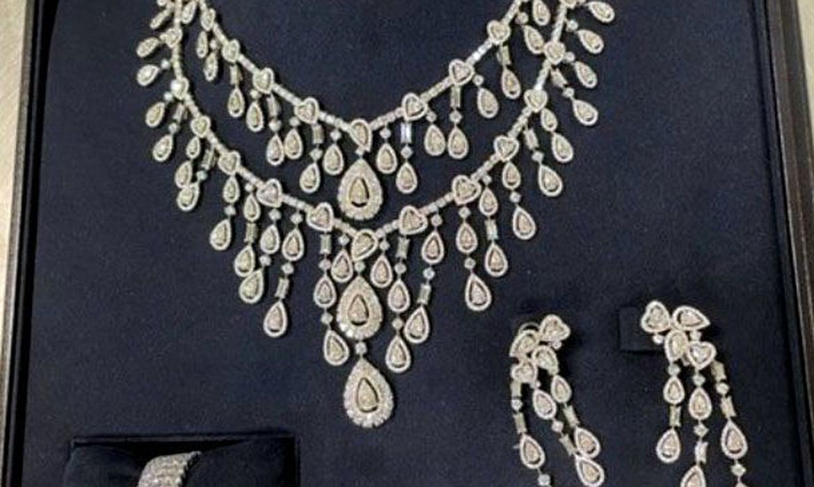 Avaliada em R$ 5,1 milhões, a caixa de joias – com colar, anel, par de brincos e relógio de diamantes – foi retida pela Receita Federal no Aeroporto Internacional de São Paulo/Guarulhos.