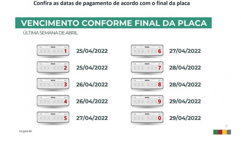 A data-limite para placas com finais 1 e 2 é 25 de abril. O vencimento dos números seguintes ocorre ao longo da última semana, encerrando-se no dia 29.